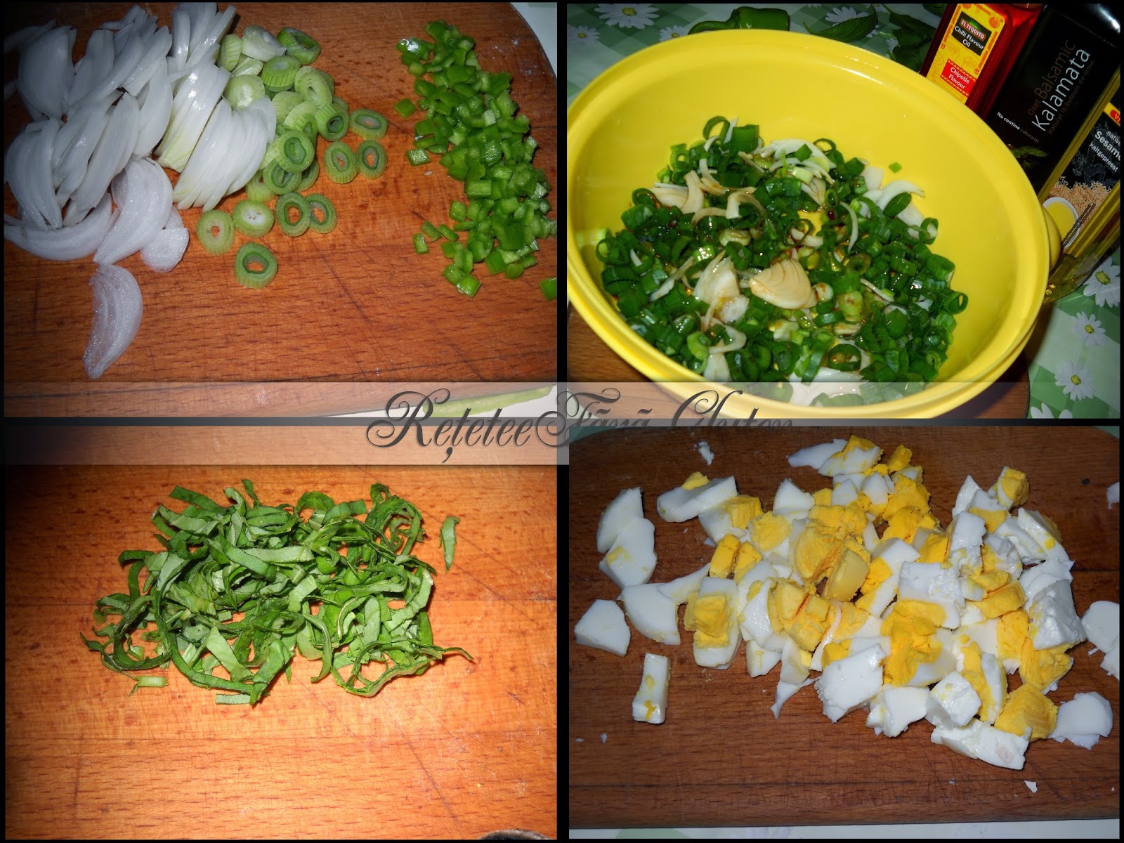 Se taie ceapa , ardeiul si patrunjelul si se adauga otetul si uleiurile peste ele si putina sare si le lasam asa pana curatam zucchini, il feliem si il saram se lasa la inmuiat cam o ora apoi se "prajeste" in tigaia grill cu foarte putin ulei . Taiem rosia si ouale fierte tare apoi prajim putin semintele fara ulei , se amesteca toate si se servesc imediat .